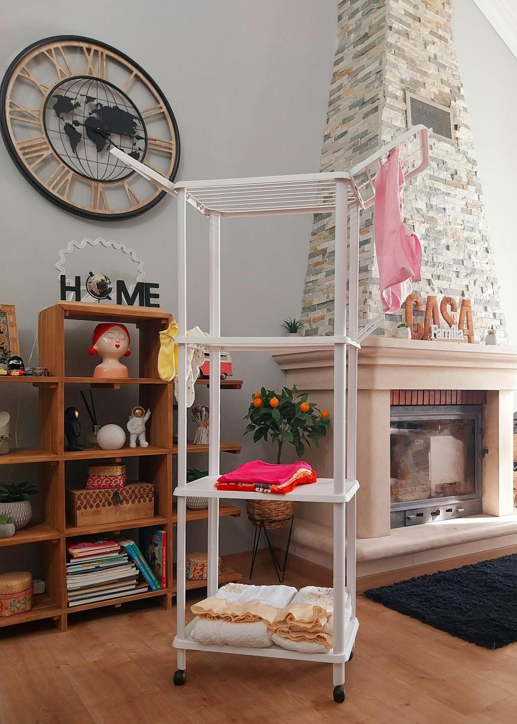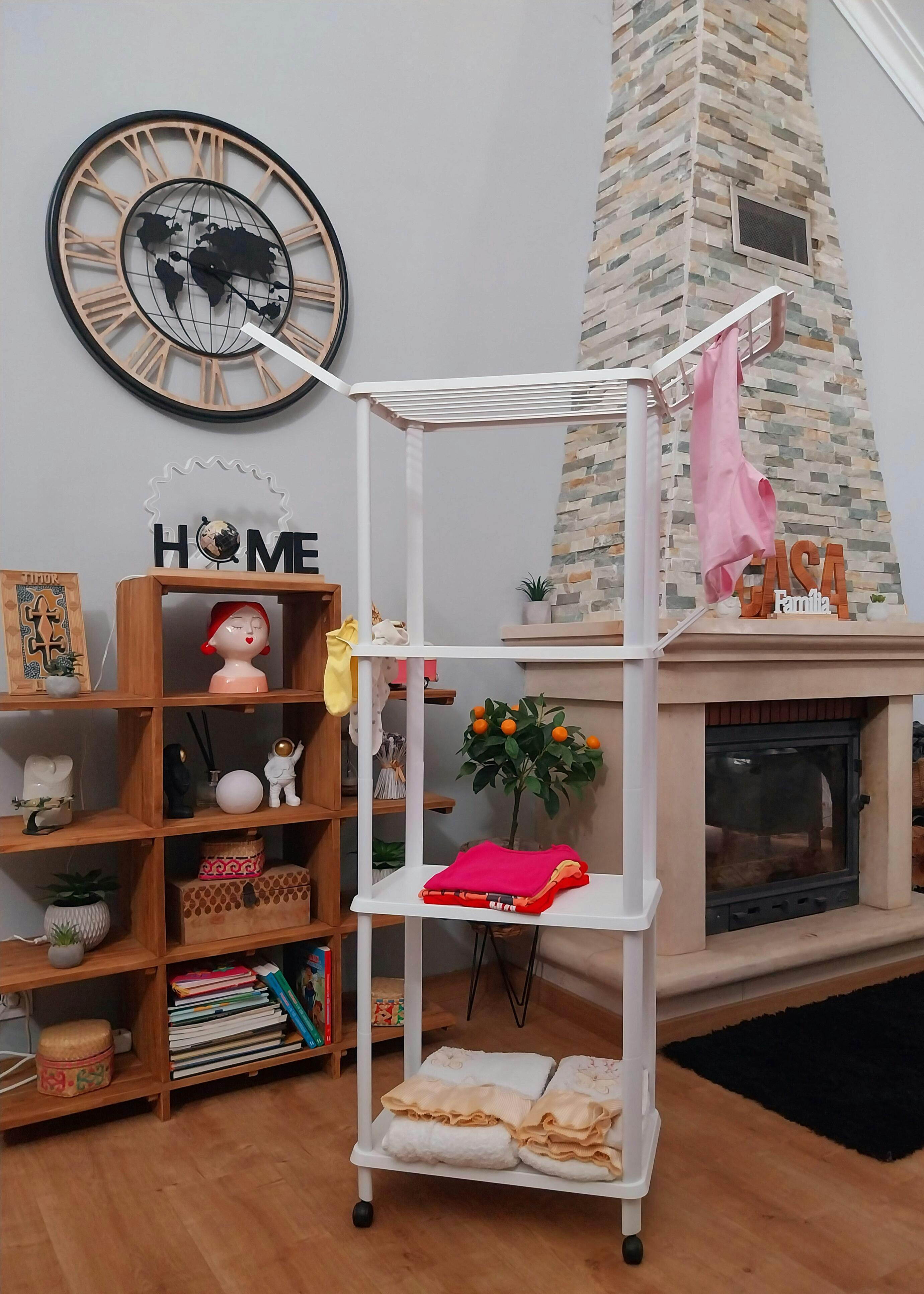 Funcionalidade Chave: Estrutura com duas prateleiras estendal e duas prateleiras de arrumação; inclui rodas para transporte fácil; ideal para apartamentos e espaços reduzidos